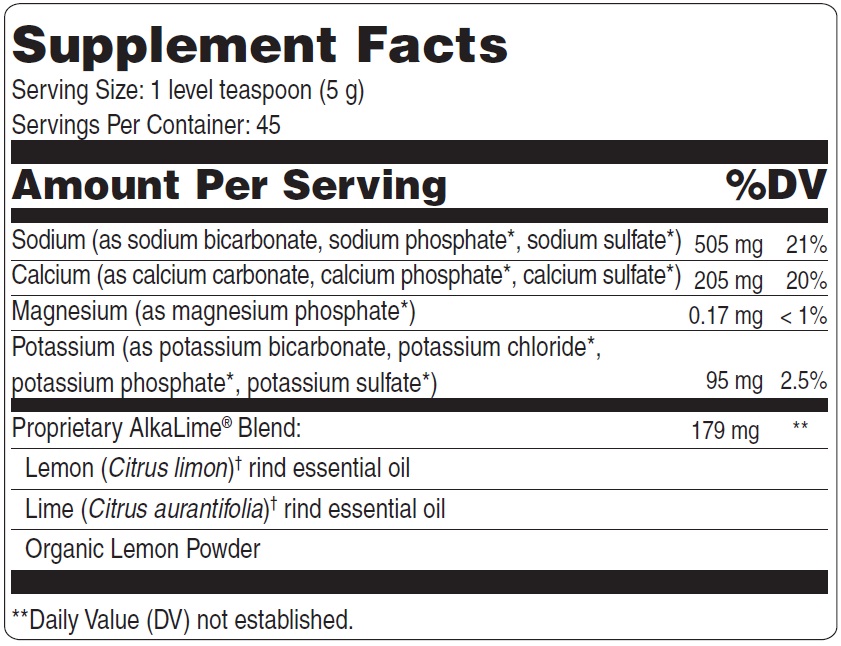 AlkaLime® is a precisely-balanced alkaline mineral complex formulated to neutralize acidity and maintain desirable pH levels in the body. Infused with lemon and lime essential oils and organic whole lemon powder, AlkaLime also features enhanced effervescence and biochemic cell salts for increased effectiveness. A balanced pH is thought to play an important role in maintaining overall health and vigor.